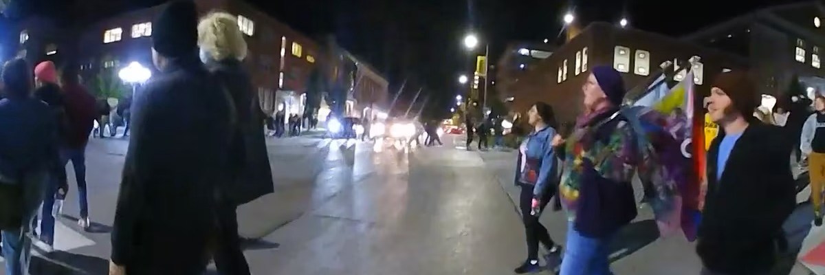 Police body-camera footage shows Tara McGovern carrying rainbow and trans rights flags during at protest on Oct. 16 at the University of Iowa in Iowa City. (University of Iowa Police Department)