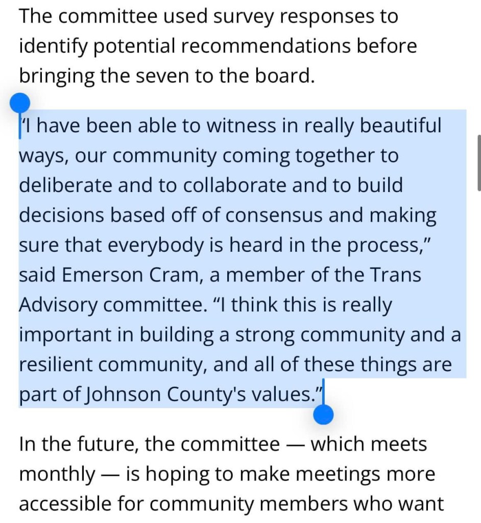 Please read Megan Woolard’s piece “Johnson County Trans Advisory committee presents initial recommendations” in the Gazette.