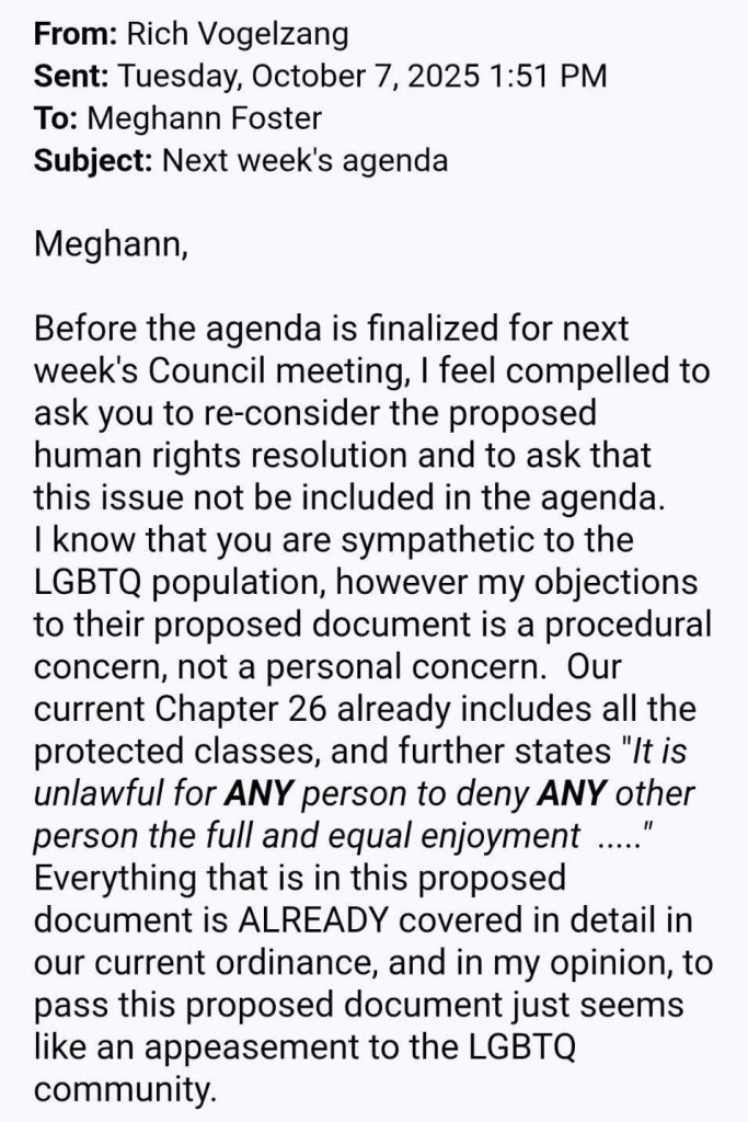 Coralville Councilor Vogelzang says that “to pass this document just seems like an appeasement to the LGBTQ community” and that “passing this proposed resolution would set an absolutely unnecessary precedent that I do not think is wise.”.